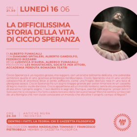 - ore 21:30 Spettacolo: LA DIFFICILISSIMA STORIA DELLA VITA DI CICCIO SPERANZA di Alberto Fumagalli (con Damiano Spitaleri, Alberto Gandolfo, Federico Bizzarri - Regia Ludovica D'Auria e Alberto Fumagalli - Produzione Les Moustaches, Società per Attori, Accademia Perduta Romagna Teatri)