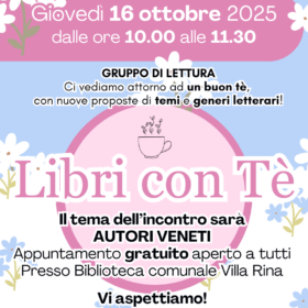 Luogo Villa Rina Malfatti Cittadella - Palazzo Villa Rina, Via Borgo Treviso 3 Date e orari 16 Ott 10:00 - Inizio evento 16 Ott 11:30 - Fine evento Aggiungi al calendario Costi Gratuito. Allegati Libri con Tè - OTTOBRE 2025 Contatti biblioteca@comune.cittadella.pd.it +39 0499413470 Con il supporto di: Biblioteca Comunale Villa Rina, Archivio di Deposito e Storico, Musei Ultimo aggiornamento: 29/09/2025, ore 12:08