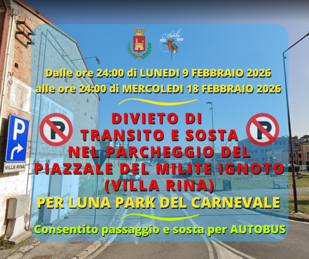 - divieto di transito e sosta nel parcheggio di Villa Rina a partire dalle 24:00 di Lunedì 9 Febbraio 2026 fino alle 24:00 di Mercoledì 18 Febbraio 2026
