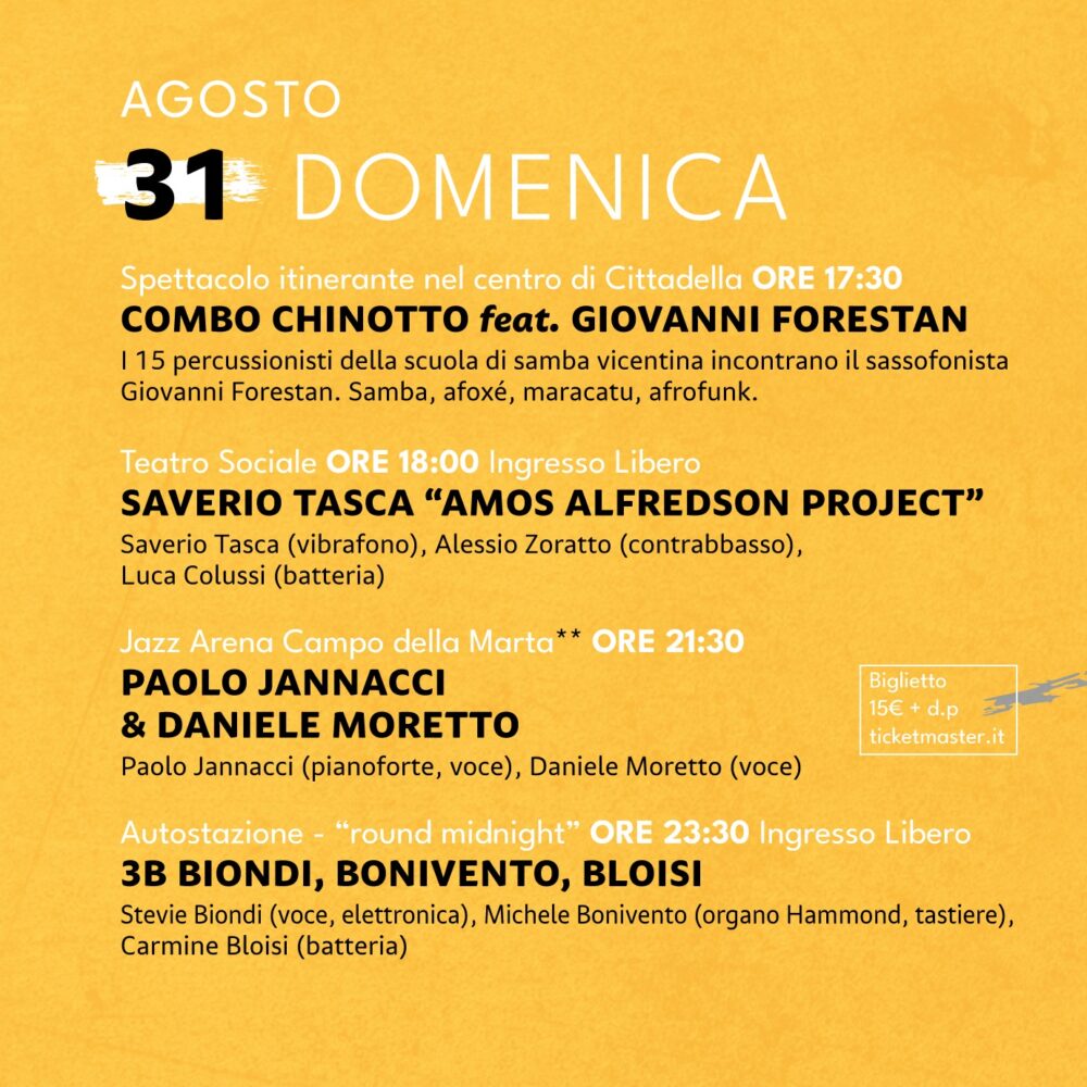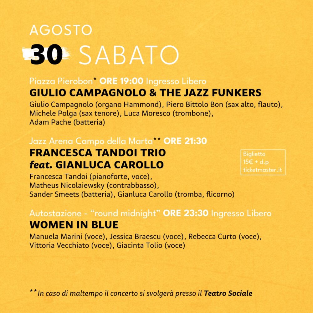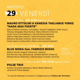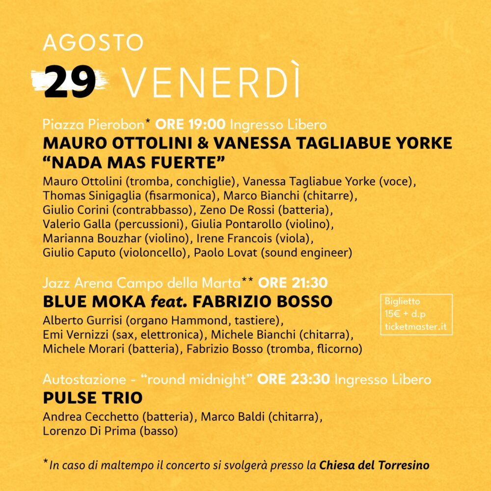- ore 21:30 - Jazz Arena Campo della Marta: BLUE MOKA feat. FABRIZIO BOSSO - Ingresso a pagamento: 15 € + d.p. su ticketmaster.it - In caso di maltempo: il concerto si svolgerà in Teatro Sociale