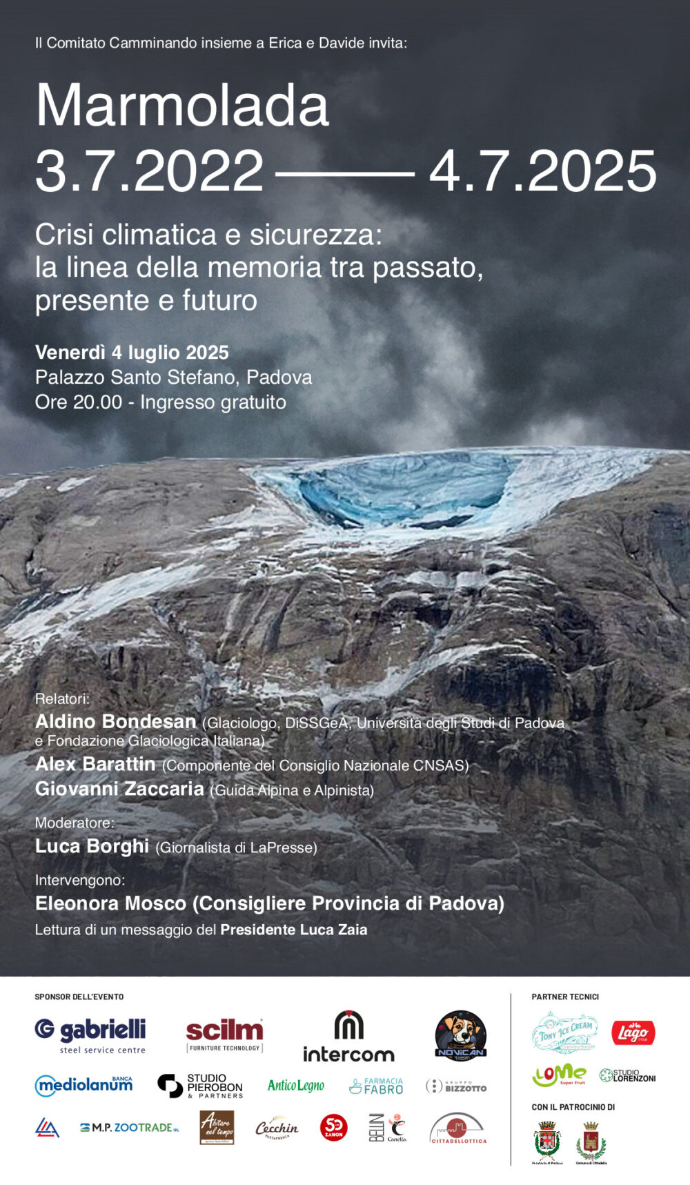 Il Comitato Camminando insieme a Erica e Davide vi invita alla conferenza "Marmolada: 3.07.2022 ________ 4.07.2025 - Crisi climatica e sicurezza: la linea della memoria tra passato, presente e futuro".
