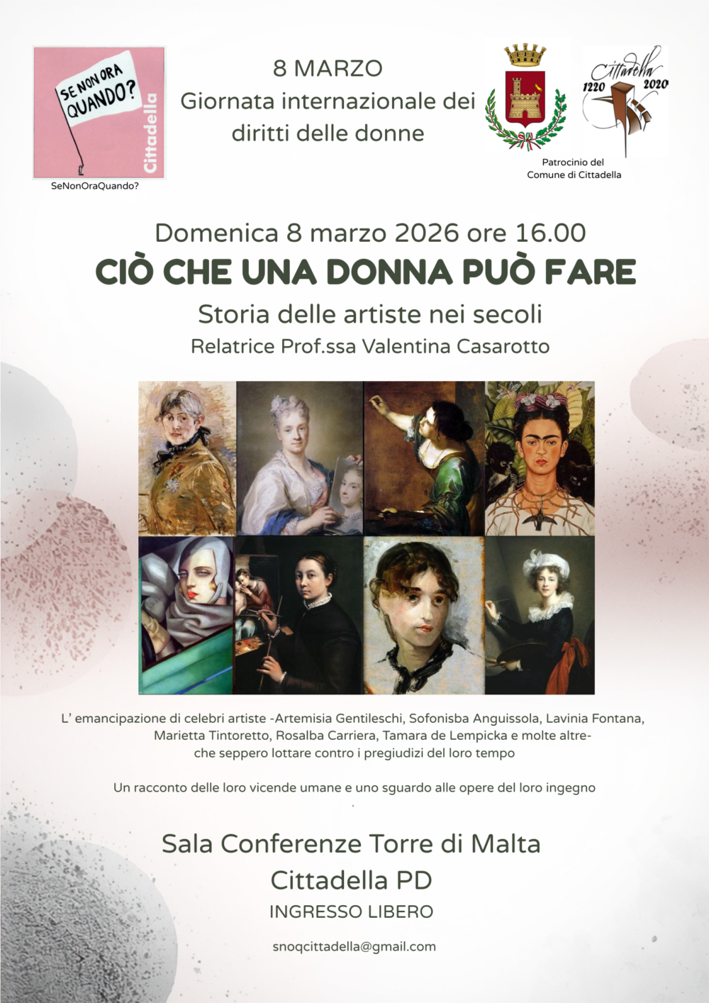 In occasione della Giornata Internazionale dei Diritti delle Donne l'ass.ne Se Non Ora Quando? di Cittadella vi invita alla conferenza "Ciò che una donna può fare - Storie delle Artiste nei secoli".