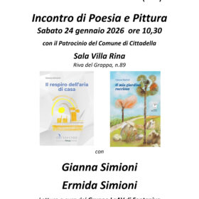 Domenica 24 Gennaio 2025 alle ore 10:30 si terrà presso la sala consiliare di Villa Rina un incontro di poesia e pittura con Gianna Simioni e Ermida Simioni.