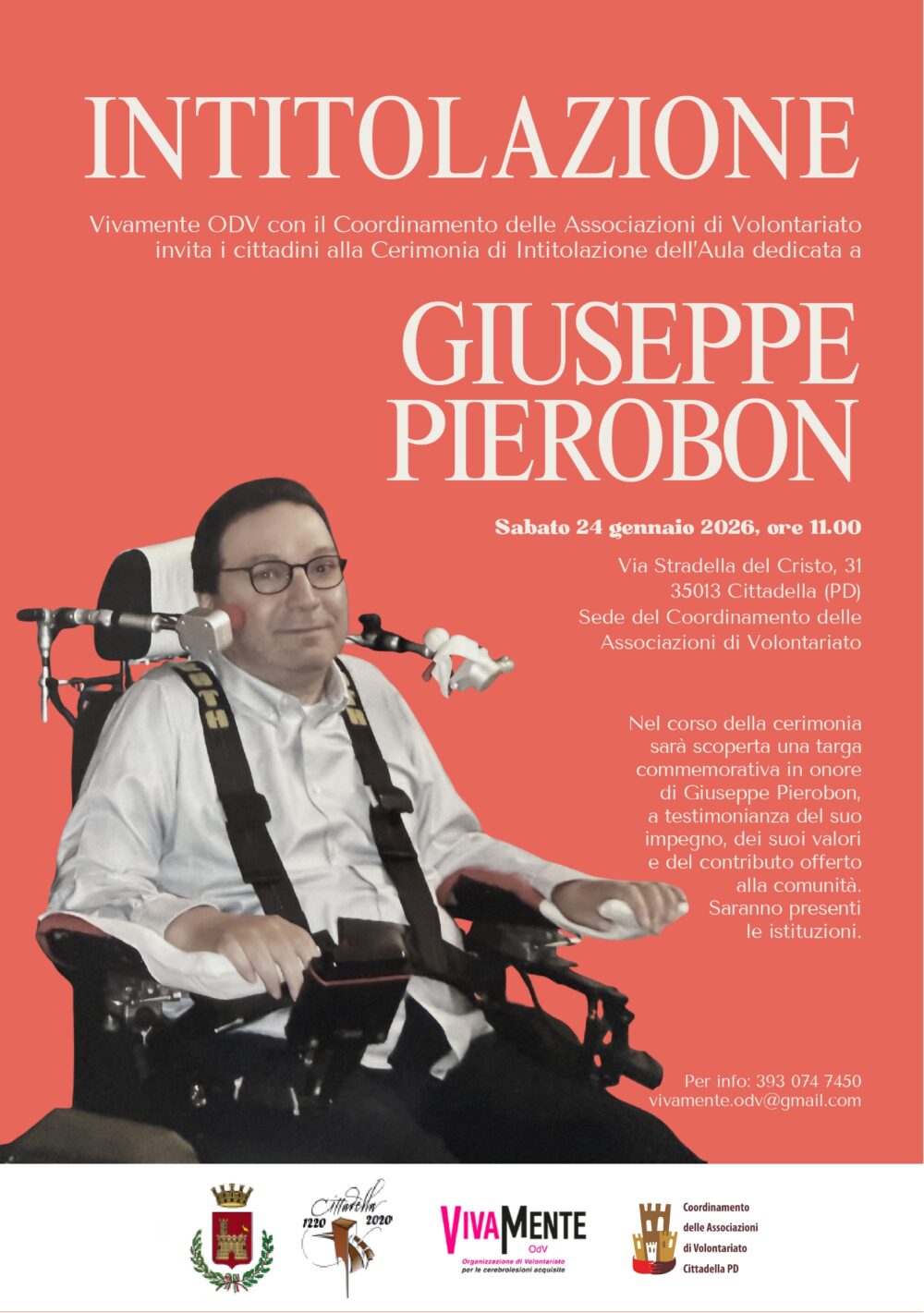 La cittadinanza è invitata alla cerimonia di intitolazione della sede del Coordinamento delle Associazioni di Volontariato al compianto cittadellese Giuseppe Pierobon (1970-2024).
