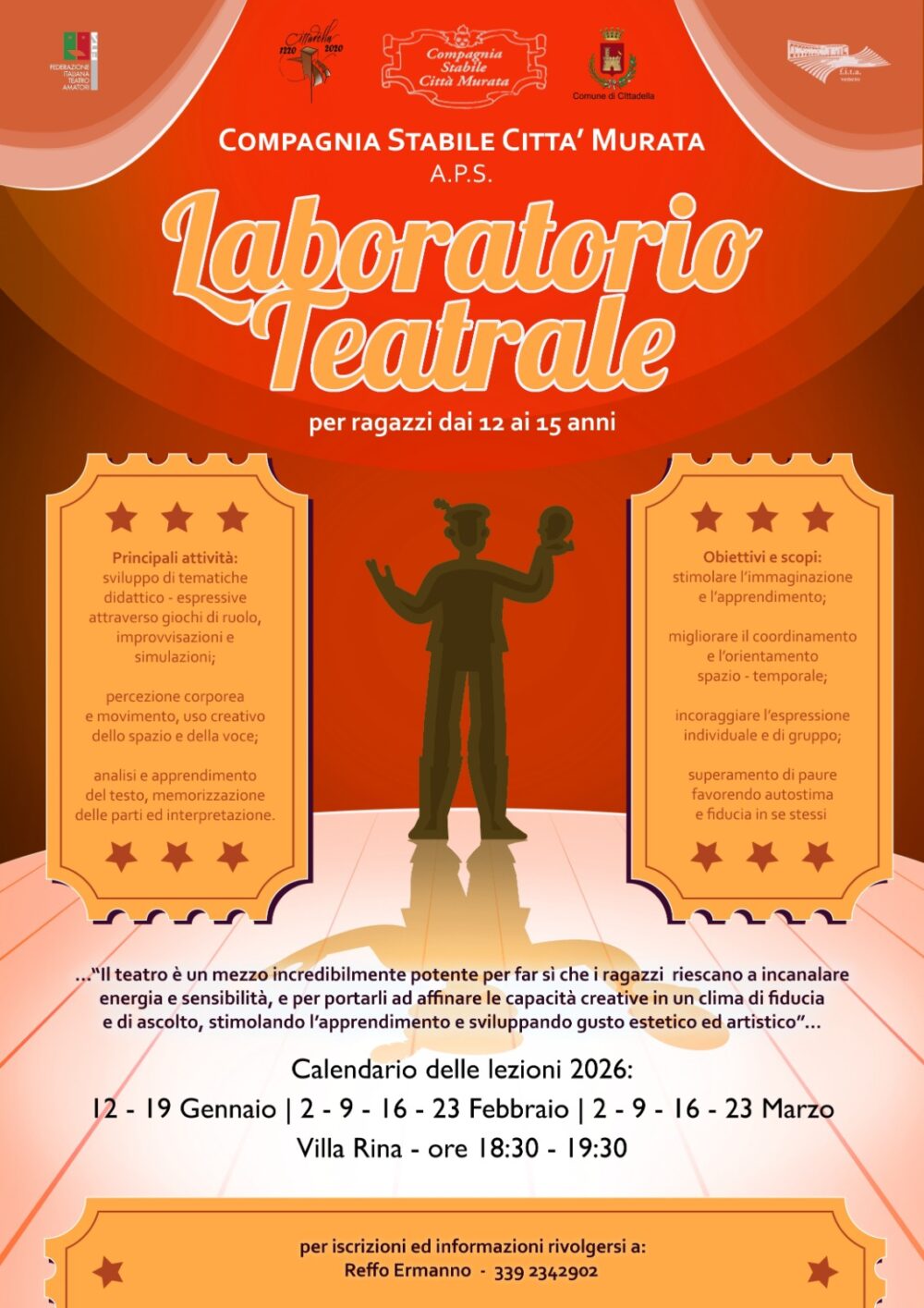 Anche per il 2026, la Compagnia Stabile Città Murata torna a riproporre un laboratorio di teatro indirizzato ai ragazzi dai 12 ai 15 anni.