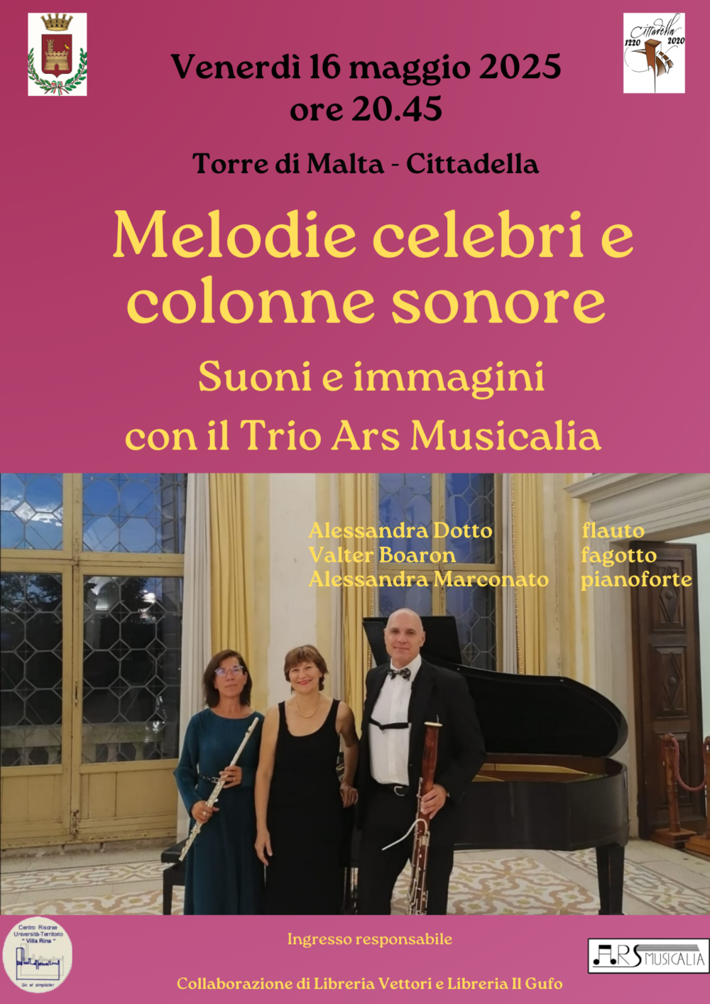 Venerdì 16 Maggio 2025 in Torre di Malta una serata in compagnia delle più celebri melodie e colonne sonore con il Trio Ars Musicalia