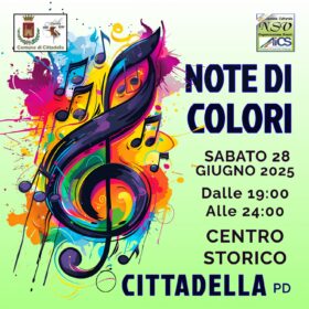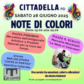 L'Associazione Culturale NSV Organizzazione Eventi APS affiliata A.I.C.S. - Comitato Provinciale di Rovigo, promuove ed organizza la manifestazione "Note di Colori" che si svolgerà Sabato 28 Giugno 2025 in centro storico dalle 19:00 alle 24:00.