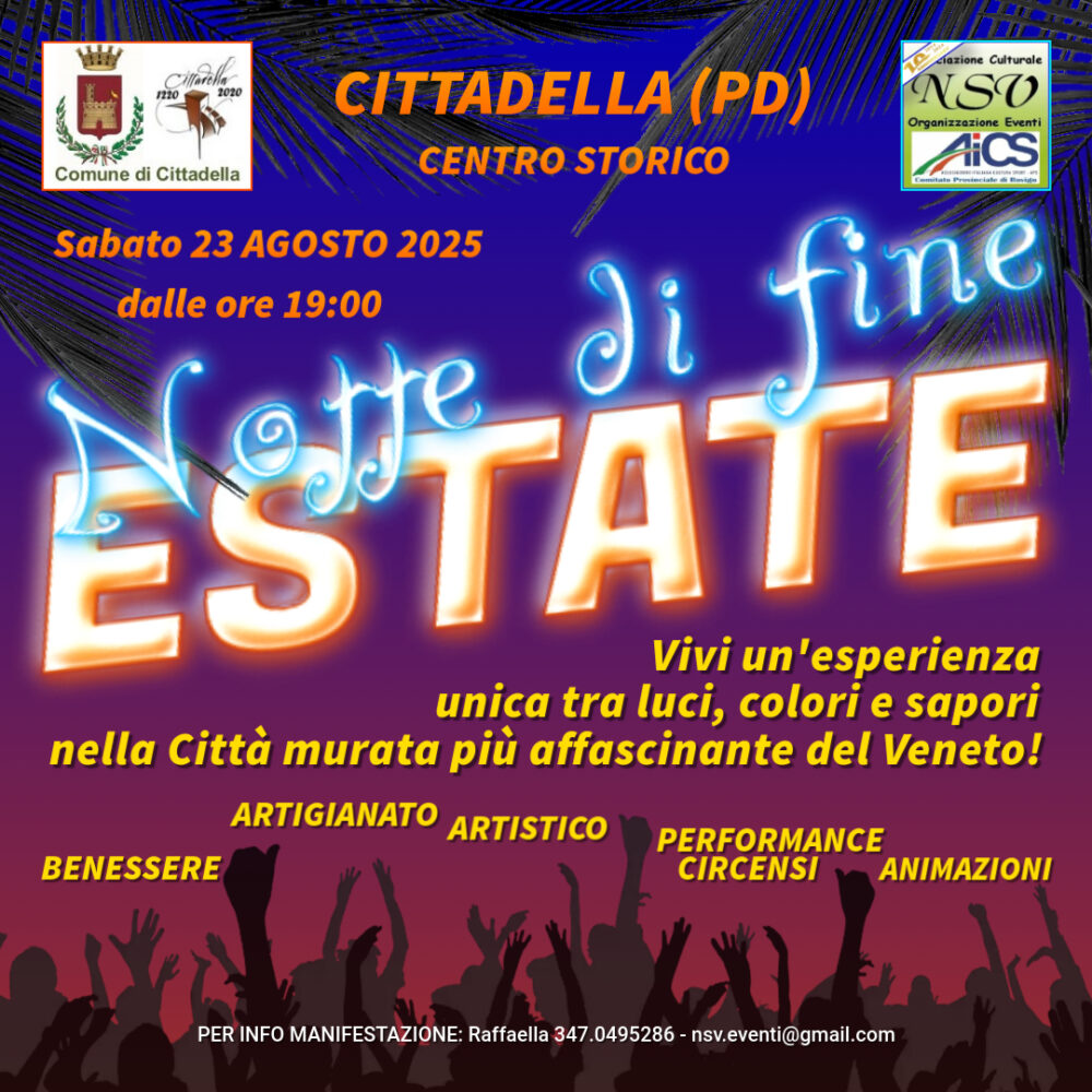 Sabato 23 Agosto 2025 si svolgerà la “Notte di fine Estate”, un evento pensato per accogliere famiglie, giovani e turisti in un’atmosfera festosa e coinvolgente. In Piazza Pierobon prenderà vita un ricco programma che unisce un colorato mercatino tematico e performance circensi, trasformando il centro storico in un luogo di incontro e meraviglia. Una festa per tutti, in cui la cultura del territorio si intreccia con momenti di intrattenimento e relax.
