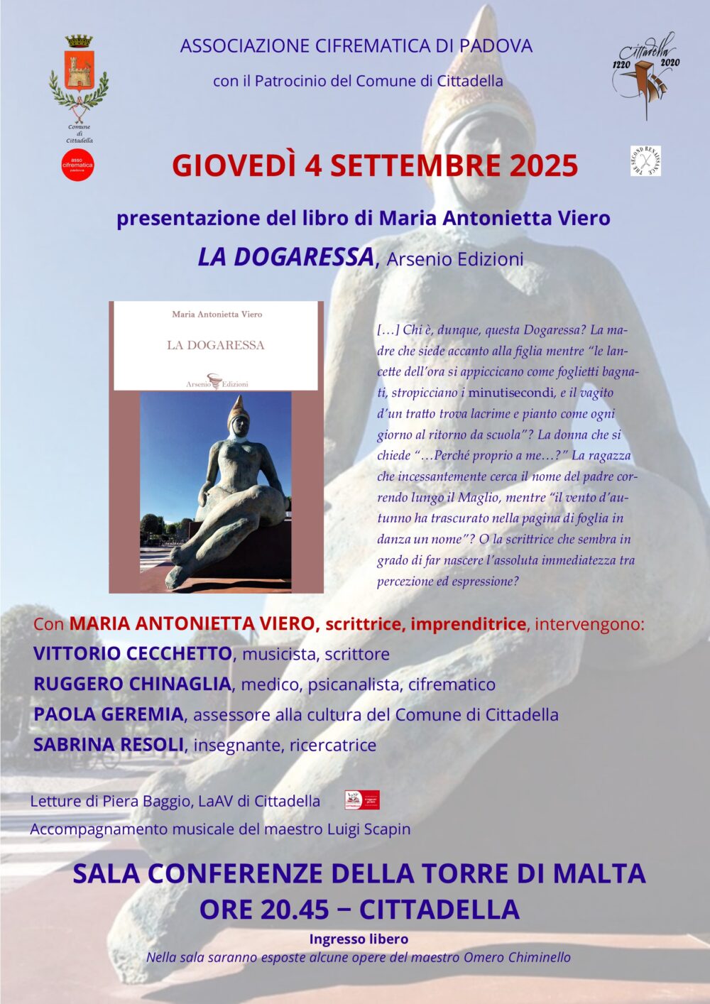 La cittadinanza è invitata alla presentazione del libro "La Dogaressa" di Maria Antonietta Viero (scrittrice ed imprenditrice).