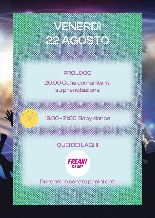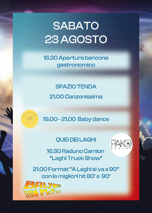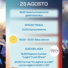 • Quei dei Laghi - 16:30: Raduno Camion "Laghi Truck Show" - 21:00: "A Laghi si va a '90" con le migliori hit '80/'90