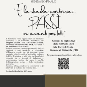 Il Seminario vuole rappresentare un momento di riflessione sul progetto svolto: verranno presentati i risultati raggiunti e verrà condivisa la valutazione dell'impatto che gli interventi hanno prodotto a livello sociale e territoriale nell'area dell'Alta Padovana e nella vita dei beneficiari coinvolti. Saranno infine condivise le opportunità e gli interventi in partenza nei prossimi mesi.